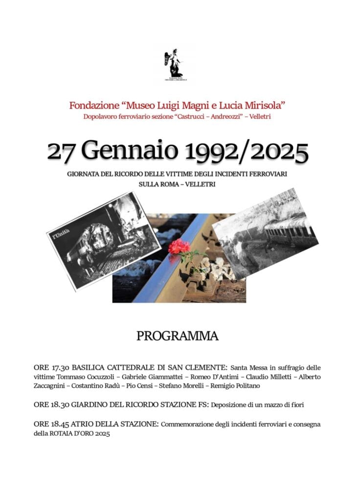 In ricordo di questi due tragici eventi la Fondazione Museo Luigi Magni e Lucia Mirisola con la sezione di Velletri del Dopolavoro Ferroviario ha organizzato nel pomeriggio del 27 Gennaio un momento di commemorazione che inizierà alle 17.30 con la Santa Messa in suffragio delle vittime nella Cattedrale di San Clemente. Alle 18.30 presso il Giardino del Ricordo nei pressi della stazione ci sarà una deposizione di un mazzo di fiori a seguire la commemorazione nell’atrio della stazione.