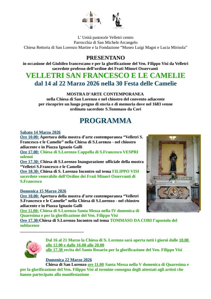 Padre Filippo diceva spesso che quando entrava nella Chiesa di San Lorenzo si sentiva “pieno di Spirito Santo” proprio questa eretta sul punto più alto di Velletri dove stettero per oltre mezzo millennio i Frati Minori Osservanti sarà la cornice di una settimana di spiritualità e cultura francescana. Con l’occasione della festa delle camelie si partirà il 14 per terminare il 22 marzo  giorni in cui l’antica Chiesa sarà aperta e visitabile con all’interno una mostra d’arte con opere di artisti provenienti dal territorio della Regione Lazio, incontri sulle figure di Filippo Visi e Tommaso da Cori, momenti di preghiera.