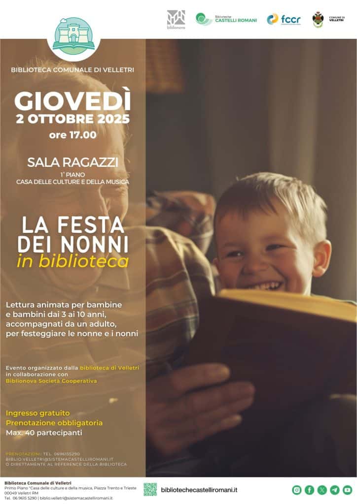 Giovedì 2 ottobre 2025 alle ore 17.00 la Biblioteca comunale di Velletri “Augusto Tersenghi” in collaborazione con Biblionova Società Cooperativa presenta l’evento di lettura ad alta voce “La festa dei nonni in biblioteca”.