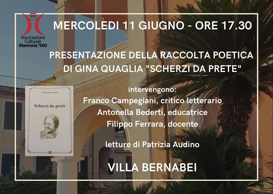 Mercoledì 11 giugno, alle ore 17.30, Villa Bernabei ospiterà la presentazione della raccolta poetica di Gina Quaglia Audino dal titolo “Scherzi da prete”. L’iniziativa, sostenuta dall’Associazione Memoria ‘900, vedrà l’intervento del critico letterario Franco Campegiani, dell’educatrice Antonella Bederti e del docente Filippo Ferrara. A leggere i versi della poetessa e maestra Gina Quaglia sarà sua figlia, Patrizia Audino, psicologa, docente e attrice. L’ingresso è libero.