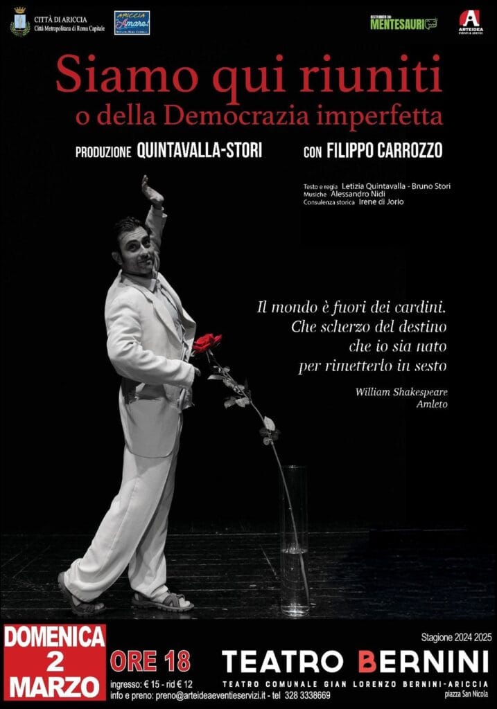 Il mese di marzo si aprirà con lo spettacolo “Siamo qui riuniti. O della democrazia imperfetta” scritto e diretto da Letizia Quintavalla e Bruno Stori, con Filippo Carrozzo (domenica 2 alle ore 18). Domenica 16 marzo, sempre alle 18, in scena “Le signorine nel tempo. L’epopea delle Signorine Buonasera” di Veronica Liberale, per la regia di Pietro De Silva, con Camilla Bianchini, Giada Fradeani, Veronica Liberale, Luigi Pisani, Simone Rogante. Sabato 29 marzo (ore 20), invece, ci sarà un altro imperdibile week end con “Vita da Principi”.