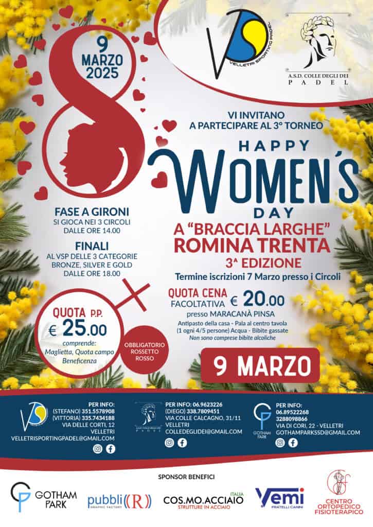A Velletri il 3° Torneo di Padel Happy Women’s Day “A braccia larghe” in ricordo di Romina Trenta