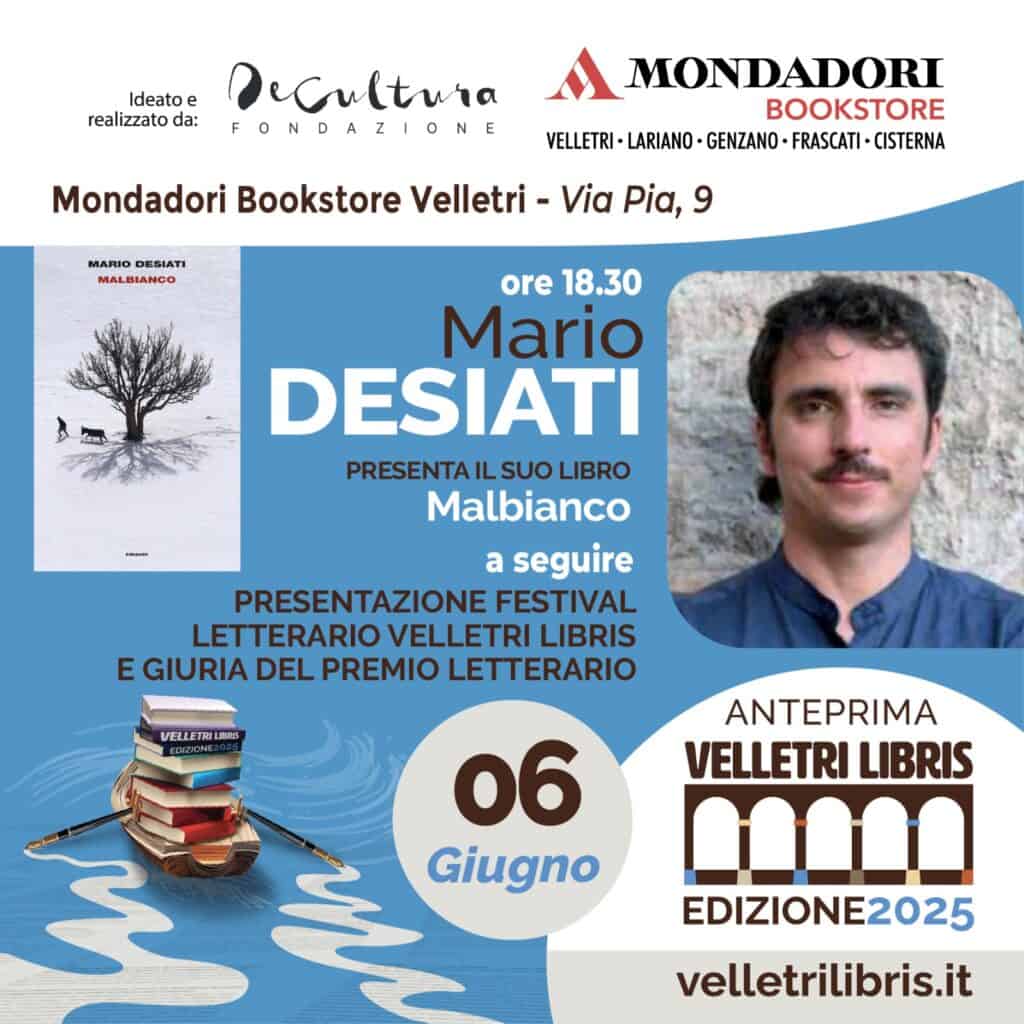 Venerdì 6 Giugno prossimo, alle ore 18.30, la Libreria Mondadori Bookstore di Velletri ospiterà lo scrittore Mario Desiati (Premio Strega 2022) per parlare del suo nuovo libro “Malbianco”, Einaudi editore. L’evento precederà la conferenza stampa di presentazione della rassegna Letteraria Velletri Libris e la presentazione della giuria del Premio Letterario Velletri Libris 2025, i cui termini per la partecipazione si sono chiusi lo scorso 15 maggio con un’alta affluenza di racconti da tutta Italia e persino dall’estero.