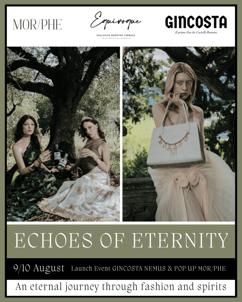 MOR/PHE è il primo e unico brand al mondo di borse trasformabili con design brevettato, nato da un’idea e dalla visione della giovane designer Alessandra Michelini. MOR/PHE è molto più di un marchio di moda: è un progetto artistico, sostenibile e modulare, che si inserisce nel panorama della slow fashion internazionale. Ogni borsa è progettata per cambiare forma, adattarsi e durare nel tempo: una risposta concreta all’urgenza ambientale e al bisogno di nuove narrazioni nel mondo dell’accessorio. A Monte-Carlo, MOR/PHE presenta la collezione Echoes of Change, ispirata alla mitologia greca e alle trasformazioni interiori. Le borse portano il nome di ninfe che hanno vissuto metamorfosi, diventando simbolo di identità fluida e libertà espressiva.
