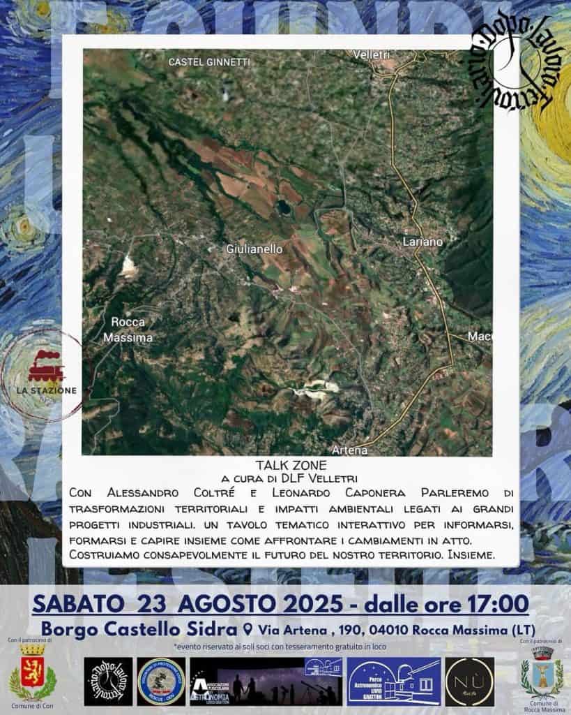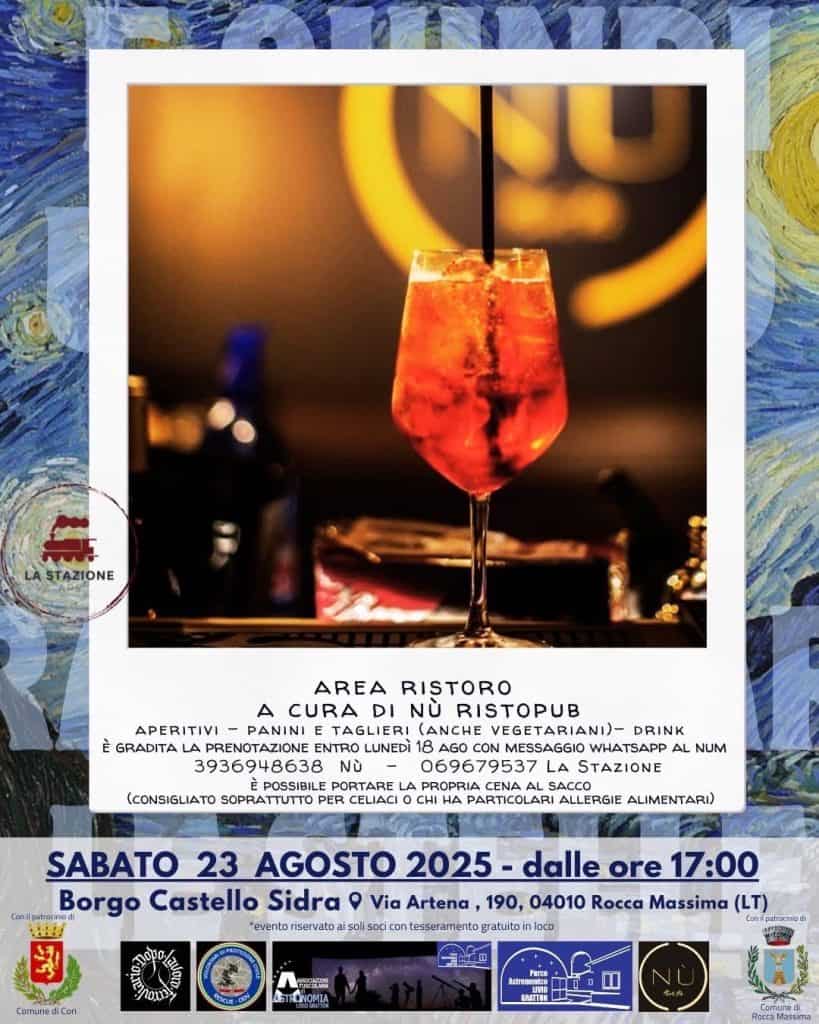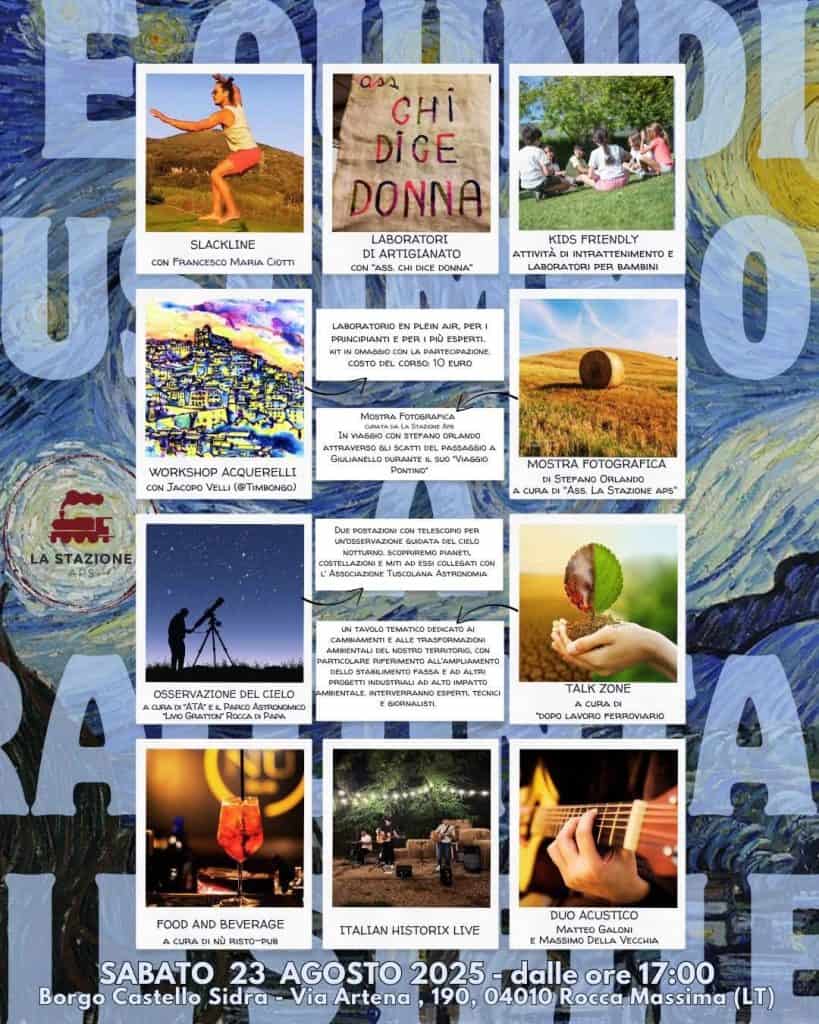 “E quindi uscimmo a raccontar le stelle…”: sabato 23 agosto, dalle 17:00, al Borgo Castello Sidra (Via Artena 190, Rocca Massima – LT) una serata in cui la bellezza del cielo, della natura e delle storie del nostro territorio si intreccerà con l’arte, con la scienza e con l’attivismo cittadino.