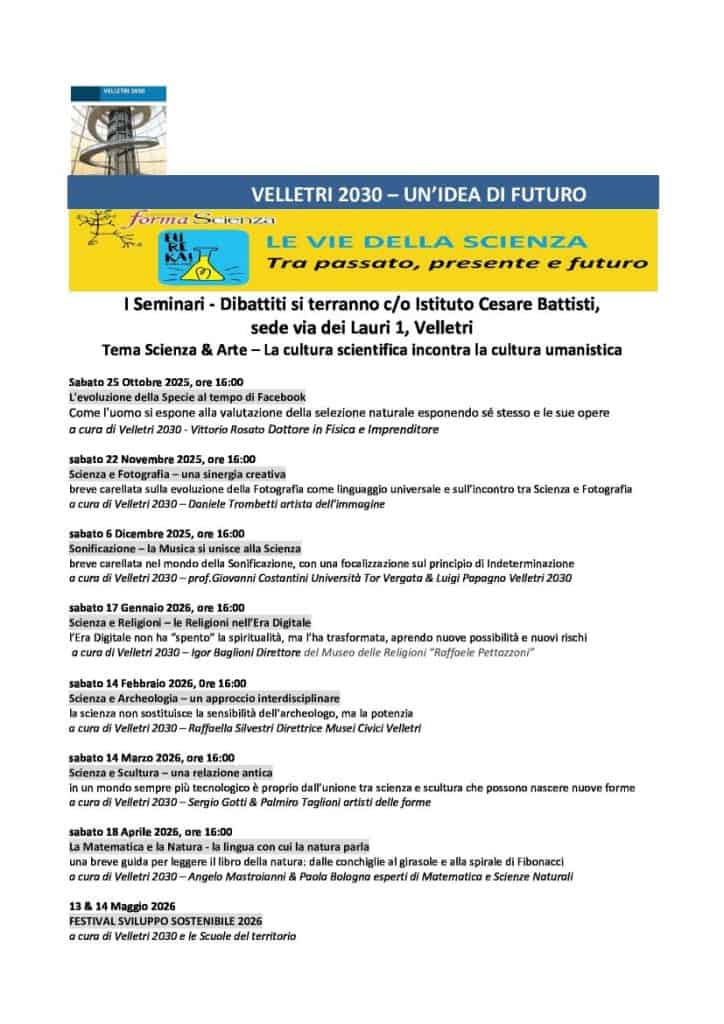 Velletri 2030 da anni si propone di creare un rete per ragionare insieme su come le scoperte scientifiche stanno plasmando il futuro, favorendo uno Sviluppo Sostenibile della società. L’idea può sembrare un ossimoro: come si fa a vedere qualcosa che non esiste ancora nella realtà? Gli oggetti e le iniziative che verranno valorizzate attraverso la rete Velletri 2030 esistono: ci sono tanti inventori e innovatori, anche giovani, che sviluppano idee che un giorno forse si trasformeranno in oggetti o in tecnologie che verranno usate quotidianamente da tutti noi. Bisogna aiutarli! Creare occasioni e progetti che li coinvolgano. Ci sono centri di ricerca, università, imprese che stanno studiando come progettare e realizzare la sedia del futuro, il tavolo del futuro, l’auto del futuro, giusto per fare qualche esempio. Aiutamoli diffondendo e stimolando la crescita di una cultura scientifica. Velletri 2030 nel suo piccolo cerca di contribuire a tutto ciò attraverso l’organizzazione di Eventi e Seminari. Per esempio, il ciclo di Seminari sul tema “La cultura scientifica incontra la cultura umanistica“.