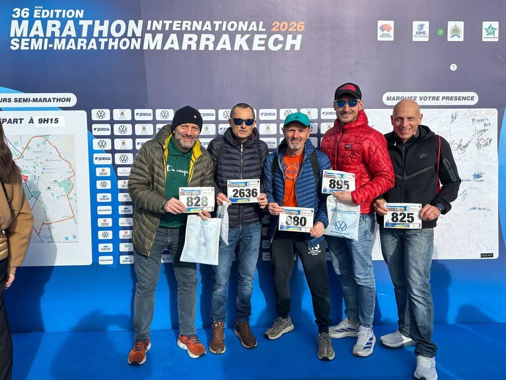 Domenica 25 trasferta in Marocco per 6 free runners che partecipano alla “Marathon International de Marrakech”. Tutti hanno concluso con entusiasmo questa splendida avventura: Enrico Di Cosimo chiude in ‘3:08:42; Angelo Colucciello in ‘3:28:20; Fabio Simonte in ‘3:59:53; Gianluca Belardini in ‘4:17:53; Mara Cecchini in’4:40:27 e Pietro Bernardo che conclude la sua 111° maratona in ‘5:31:34.