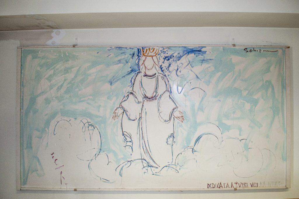 La struttura in cui Schifano fu detenuto è chiusa ormai ed è stata sostituita da un complesso più moderno, ma qualcosa del grande artista è rimasto. Accolto dalle autorità del carcere, Aurelio Picca ha infatti individuato, apprezzato, scrutato e fotografato una gigantesca tela azzurra: una grande Madonna incoronata che si posa tra le nuvole. Un dipinto enorme, 3 metri e 60 di lunghezza per 1 metro e 86 di altezza, che Schifano dedicò ai suoi compagni di sventura e che è stata trasferita dal vecchio al nuovo penitenziario.