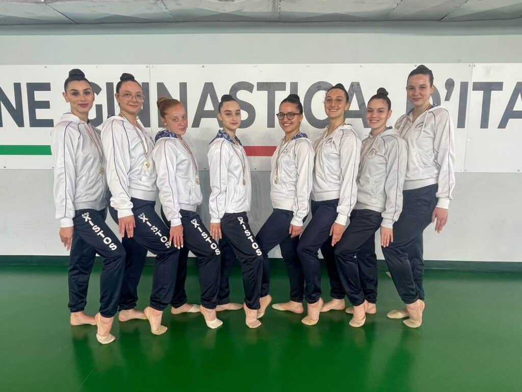 Nella categoria Open a scendere in pedana per l’ASD Xistos, alternandosi nei tre esercizi previsti dal programma (collettivo a corpo libero, successione palla-nastro e coppia cerchi) sono state: Di Caprio Elena, Galli Cecilia, Perillo Marta, Rosca Alessia, Caporro Camilla, Di Luzio Giada, Dell’Andrea Giulia e Sirignano Valentina. A queste ragazze facciamo dei grandissimi complimenti, poiché hanno preparato questa gara in poco più di due settimane e, nonostante qualche piccolo errore esecutivo dovuto alle nuove composizioni ancora non molto rodate, riescono ad eseguire tre buoni esercizi grazie ai quali ottengono un ottimo 14º posto su ben 26 squadre partecipanti in un contesto di alto livello e in una classifica strettissima, dove a poco più di un punto si poteva raggiungere il podio!
