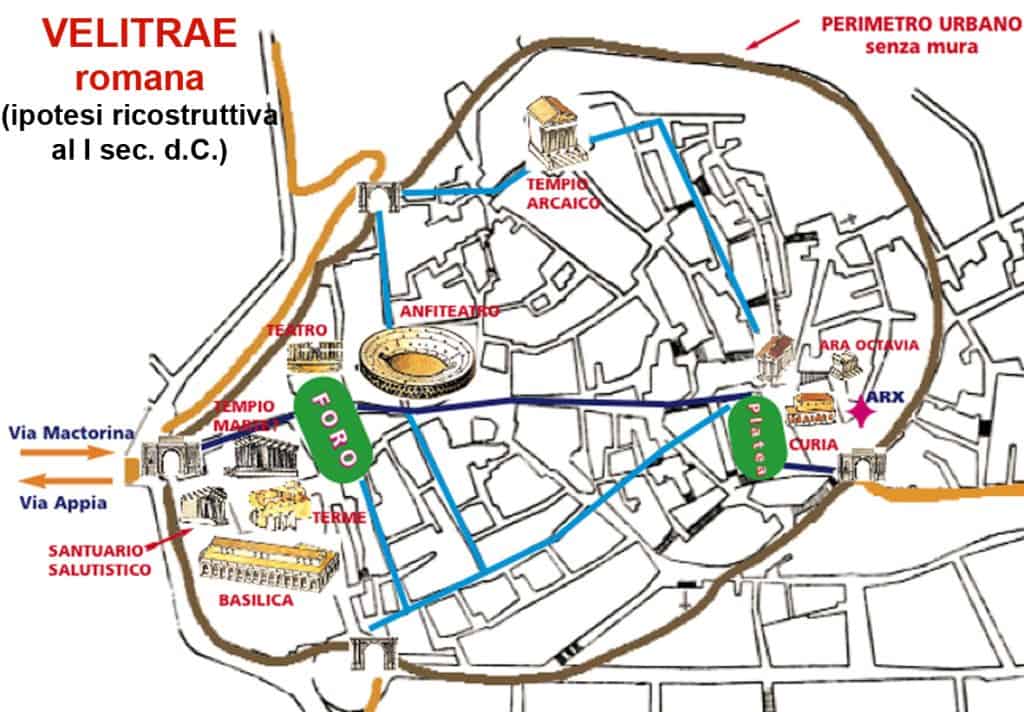 E a questa nonna viene affidato il piccolo Ottaviano: mentre la madre rimane a Roma, nonna e nipote vivranno per i successivi otto anni a Velletri nella rustica villa paterna degli Ottavi che sappiamo essere stata nell’attuale contrada di Madonna degli Angeli (in passato, località S.Cesareo). Ottaviano ricevette qui un’educazione di prim’ordine, in un ambiente sereno e tranquillo. Nel 51 aC muore la nonna Giulia e Ottaviano torna a Roma dalla madre, che s’era risposata, per proseguire la sua istruzione. Sono anni di guerre civili, proscrizioni, lotte tra fazioni e suo zio Cesare è al centro di questa lotta per il potere. Quando nel 49 aC scoppia la guerra tra Cesare e Pompeo, Azia rispedisce Ottaviano a Velletri per metterlo al sicuro da possibili ritorsioni sulla gens Julia. Il giovane passerà altri due anni nella sua Velitrae. Al compimento dei 16 anni lo zio Cesare, che aveva sconfitto i suoi nemici, lo adotta e designa quale suo erede avviandolo verso quel destino che lo porterà a diventare Cesare Ottaviano Augusto, fondatore dell’Impero romano. Augusto, quindi, quasi certamente non è nato a Velletri ma discende da una famiglia veliterna e a Velletri ha vissuto e s’è formato fino alla prima giovinezza: formazione che sembra aver influenzato stile di vita e orientamenti politici della piena maturità.