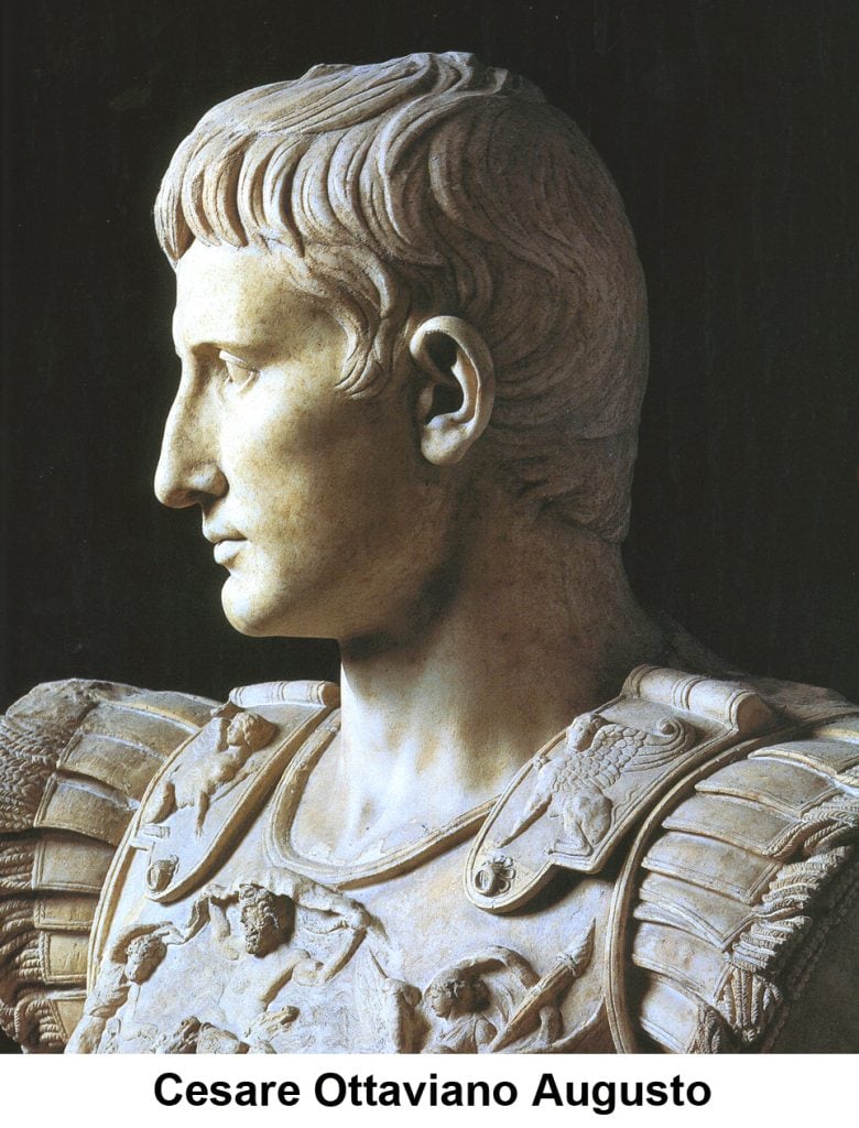 Gaio Ottavio (Ottaviano) nasce il 23 settembre del 63 aC da Gaio Ottavio, della gens Octavia di Velitrae, e da Azia Balba, della gens Balba di Aricia. Il padre proveniva da una famiglia dell’ordine equestre (commercianti con un ricco patrimonio) ed era diventato senatore dopo una onorevole carriera. Quando Ottaviano sta per compiere i quattro anni il padre muore a Nola poco prima di essere eletto console. È il 59 aC, anno in cui diviene console Caio Giulio Cesare che è prozio di Ottaviano: essendo il fratello di sua nonna materna Giulia, amatissima sorella del grande generale romano.