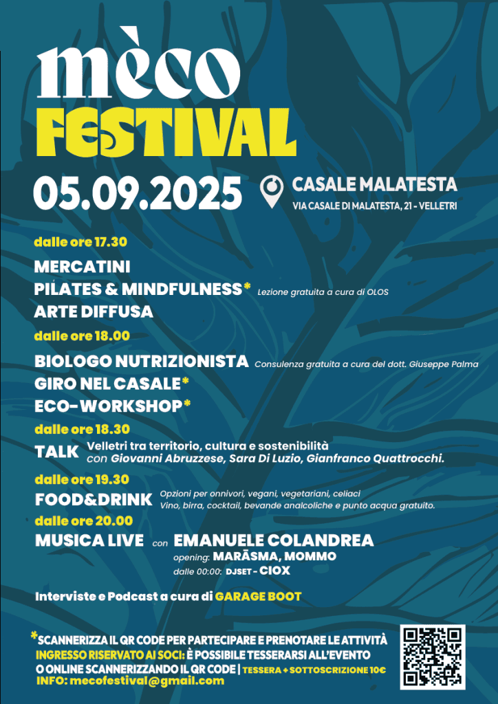 Organizzato da Mèco APS, il festival propone varie attività che, dalle 17:00 fino alla mezzanotte, accompagneranno i soci in un percorso dedicato alla valorizzazione del territorio e dell’ambiente attraverso musica, cibo, artigianato e momenti di dialogo con esperti.