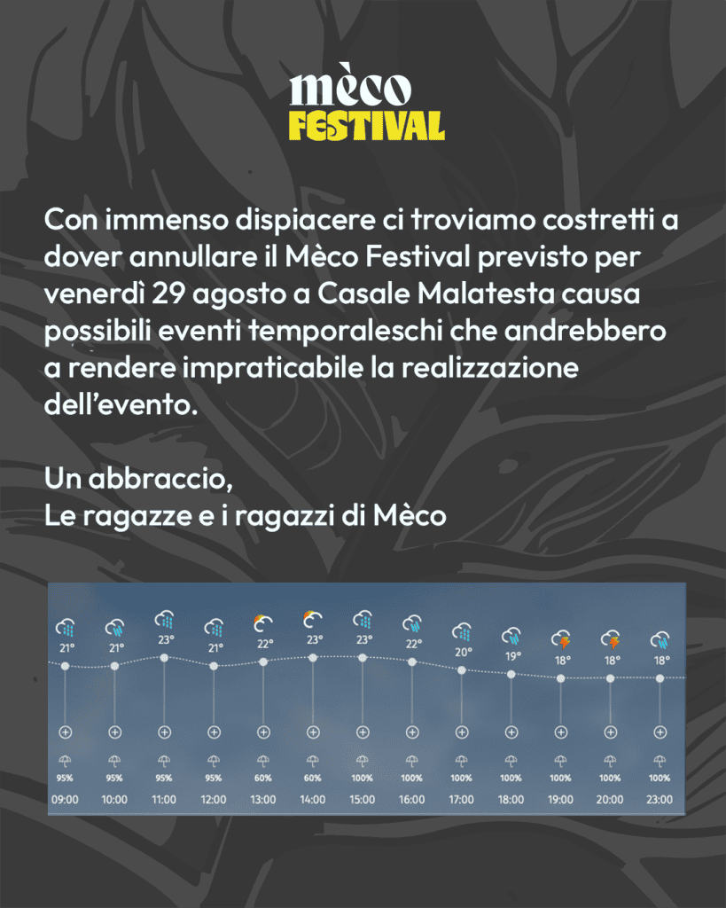 Con immenso dispiacere ci troviamo costretti a dover annullare il Mèco Festival previsto per venerdì 29 agosto a Casale Malatesta causa possibili eventi temporaleschi che andrebbero a rendere impraticabile la realizzazione dell’evento.