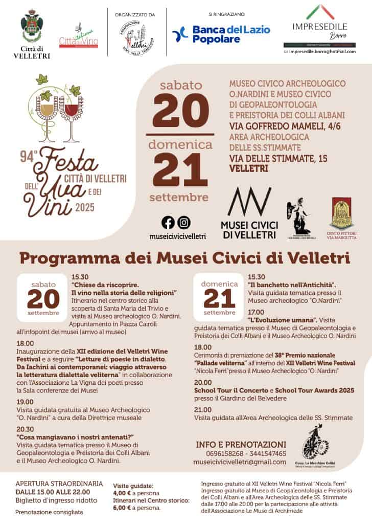 Sabato 20 e domenica 21 settembre si svolgerà a Velletri la 94° edizione della Festa dell’uva e dei vini di Velletri e del territorio e per l’occasione i Musei Civici di Velletri: Museo Archeologico “O.Nardini”, Museo di Geopaleontologia e Preistoria dei Colli Albani e Area Archeologica delle SS. Stimmate saranno aperti, dalle ore 15:00 alle ore 22:00.