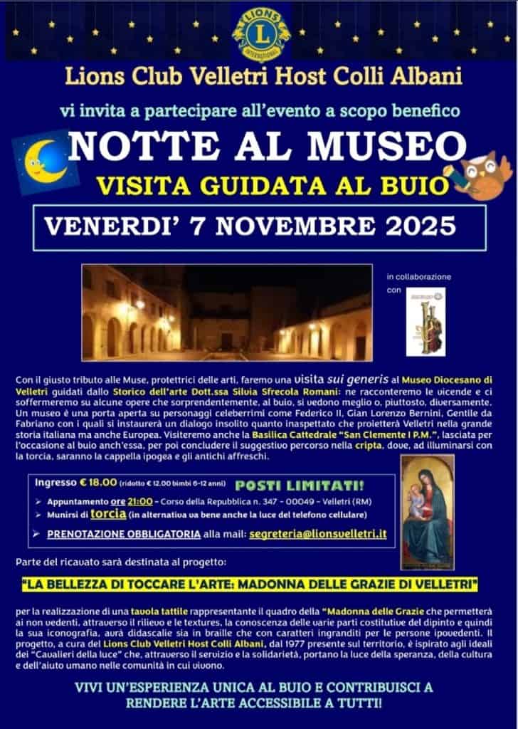 Il Lions Club Velletri Host Colli Albani, da sempre impegnato in attività culturali e solidali, invita la cittadinanza all’evento benefico “Notte al Museo – Visita guidata al buio”, in programma venerdì 7 novembre 2025 presso il Museo Diocesano di Velletri.