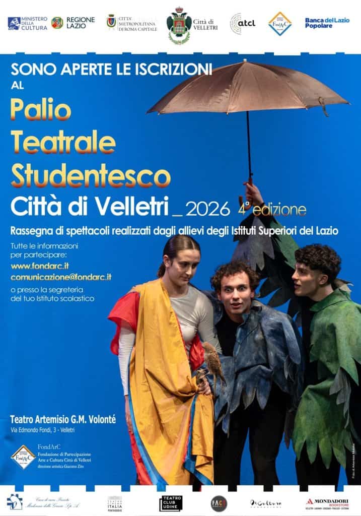 Dopo il grandissimo successo delle prime tre edizioni, ecco l’attesissima quarta stagione del Palio Teatrale Studentesco “Città di Velletri” – rassegna di spettacoli a cui possono partecipare gli allievi di tutte le scuole di Istruzione Secondaria di Secondo Grado del territorio – organizzato dalla Fondazione di Partecipazione Arte & Cultura Città di Velletri diretta da Giacomo Zito, realizzato dal Comune di Velletri, con il patrocinio di Ministero della Cultura, Regione Lazio, Città Metropolitana di Roma Capitale, la collaborazione di ATCL (Associazione Teatrale Comuni del Lazio) del Teatro Club di Udine e Mondadori Bookstore Velletri, e il contributo di Banca Popolare del Lazio.