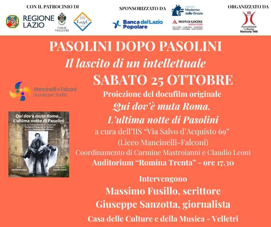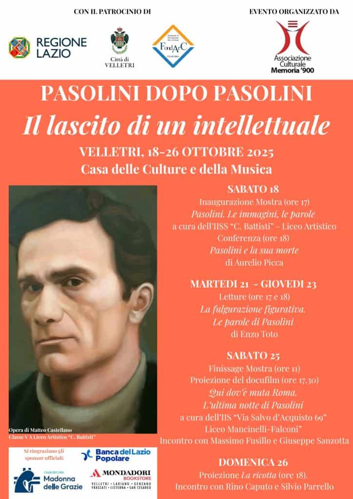Dal 18 al 26 ottobre 2025 la Casa delle Culture e della Musica di Velletri ospiterà la rassegna “Pasolini dopo Pasolini. Il lascito di un intellettuale”. La manifestazione è promossa dall’Associazione Culturale Memoria ’900 con il patrocinio di Regione Lazio, Città di Velletri e FondArc, che ha co-prodotto l’evento. Una serie di iniziative culturali di grande valore che intende rendere omaggio a Pier Paolo Pasolini attraverso una mostra, letture, conferenze e proiezioni.