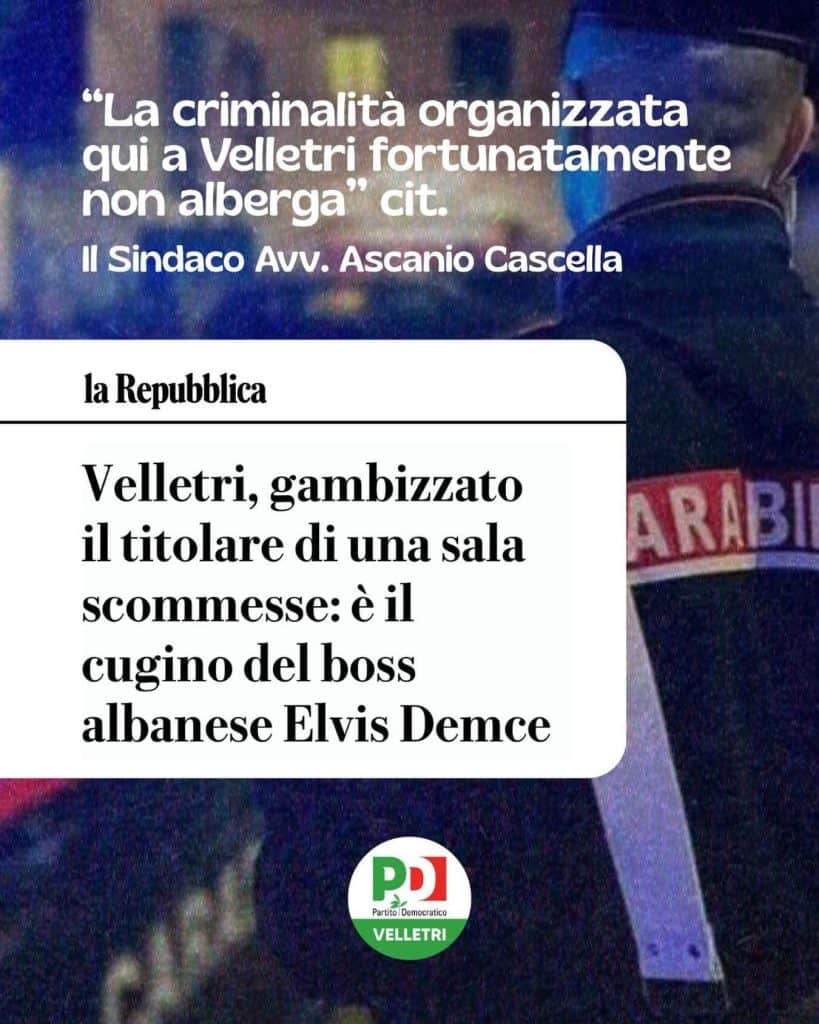 Dopo tre anni di amministrazione, Ascanio Cascella non ha ancora capito di essere il Sindaco di Velletri e, forse per deformazione professionale, continua a vestire i panni di avvocato. Non importa il contesto in quale opera: in tribunale difende i suoi clienti, sui social i suoi Assessori. E, in questo secondo caso, nemmeno tutti. Nota infatti è la sua preferenza per gli esponenti della Lega e, in particolare, per quell’Assessora Ilaria Neri disastrosa nella gestione delle deleghe alla Viabilità e al Decoro urbano. Ma per l’avvocato Cascella la realtà impone solo un’azione possibile e non c’è crisi che tenga: difendere l’indifendibile fino alla fine. A proposito, di fronte all’ennesimo atto di cronaca nera che ha colpito Velletri, con l’ultimo agguato a ridosso del centro storico che ha provocato la gambizzazione di un uomo, l’avvocato Cascella e i suoi fedeli consiglieri avranno il coraggio di riconoscere la fondatezza delle inchieste condotte dai giornalisti di La7 e trasmesse in diretta nazionale solo qualche mese fa? “La criminalità organizzata qui a Velletri non alberga” – queste le parole del Sindaco Cascella ad inizio mandato e che oggi risultano sempre più grottesche e fuori luogo (anche alla luce della sua professione di avvocato), mentre l’intera comunità, sfiduciata e allarmata, avrebbe bisogno di un Sindaco in grado di assumersi le sue responsabilità e di dare risposte concrete ai tanti problemi quotidiani. Se non ora, quando?”. Così in una nota Partito Democratico di Velletri.