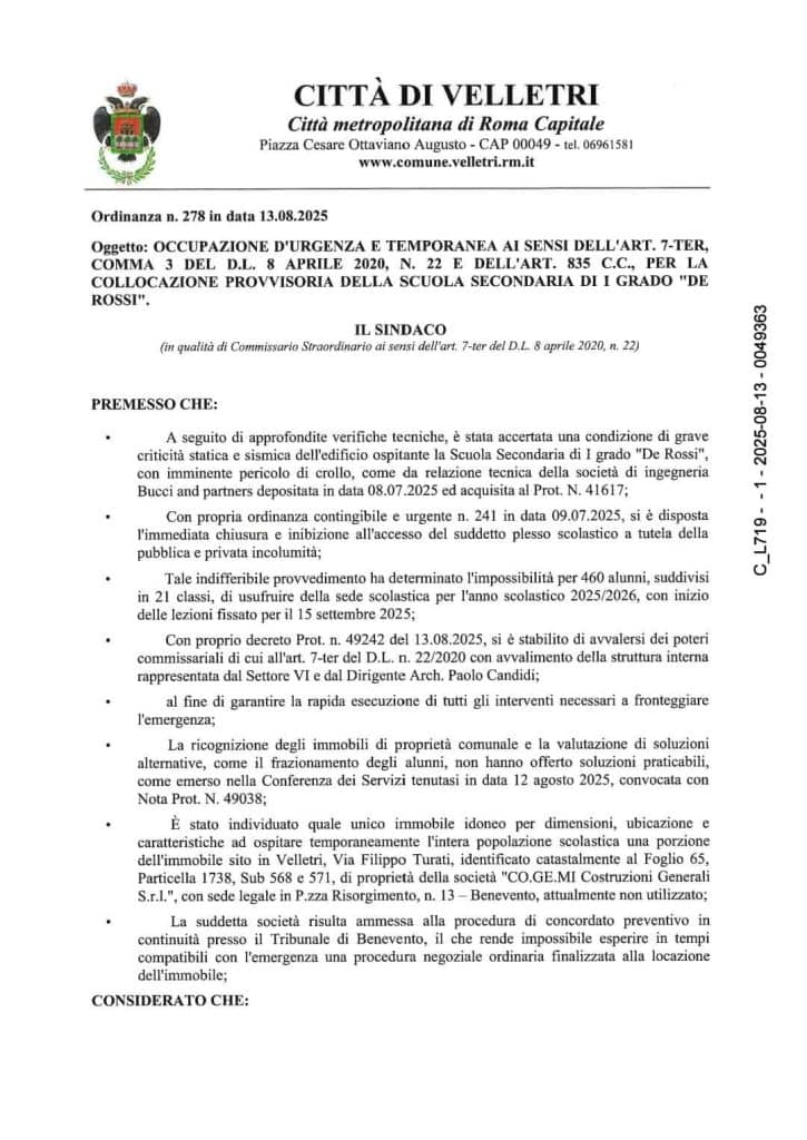 Di fronte all’emergenza senza precedenti della scuola “De Rossi”, dichiarata inagibile per un grave rischio di crollo, il Sindaco di Velletri, Avv. Ascanio Cascella, ha agito con la massima determinazione per garantire il regolare avvio dell’anno scolastico a tutti i gli studenti. Con decreto emesso pochi minuti fa, in qualità di Commissario Straordinario, il Sindaco ha disposto la occupazione d’urgenza e temporanea di un grande porzione dell’immobile c.d. “Ciambellone”, che sarà trasformata a tempo di record in una sede scolastica sicura e funzionale.