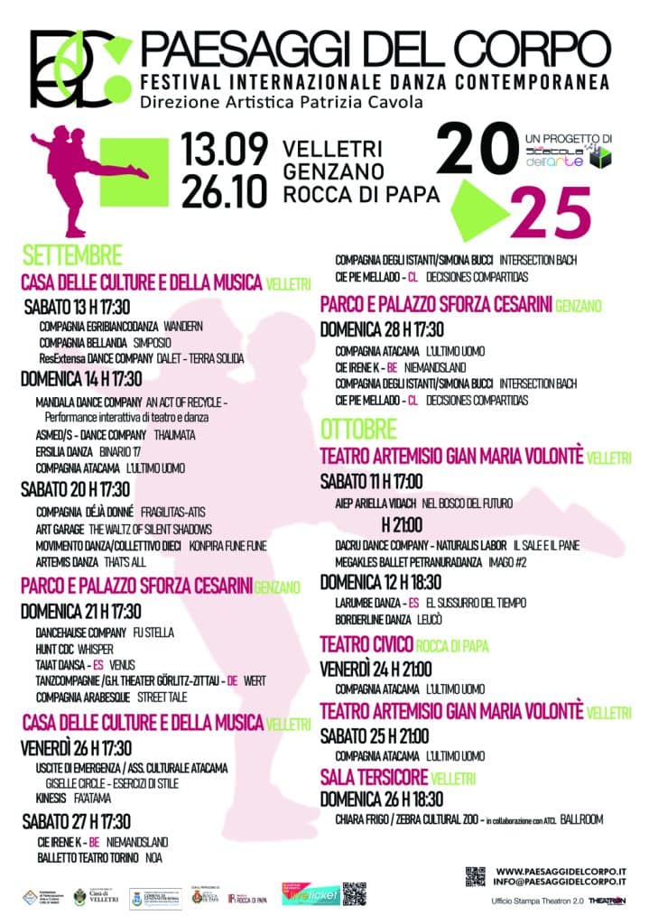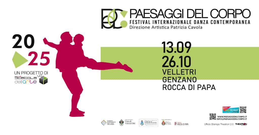 Torna a illuminare i Castelli Romani, Paesaggi del Corpo – Festival Internazionale Danza Contemporanea, progetto de La Scatola dell’Arte ETS, ideato e diretto da Patrizia Cavola, con un’edizione 2025 che si annuncia come la più ricca e internazionale di sempre: dal 13 settembre al 26 ottobre, tra Velletri, Genzano e Rocca di Papa, il pubblico sarà accompagnato in un viaggio che intreccia corpi, linguaggi e visioni, con compagnie provenienti da Italia, Belgio, Spagna, Germania e Cile. Una rassegna che abbraccia oltre trenta appuntamenti e porta in scena nomi di spicco del panorama coreografico internazionale: EgriBiancoDanza, ASMED/Balletto di Sardegna, Déjà Donné, Artemis Danza, Compagnia Atacama, DanceHaus Company, Taiat Dansa, Balletto Teatro Torino, Irene K, Larumbe Danza, Borderline Danza, Mandala Dance Company e molti altri.