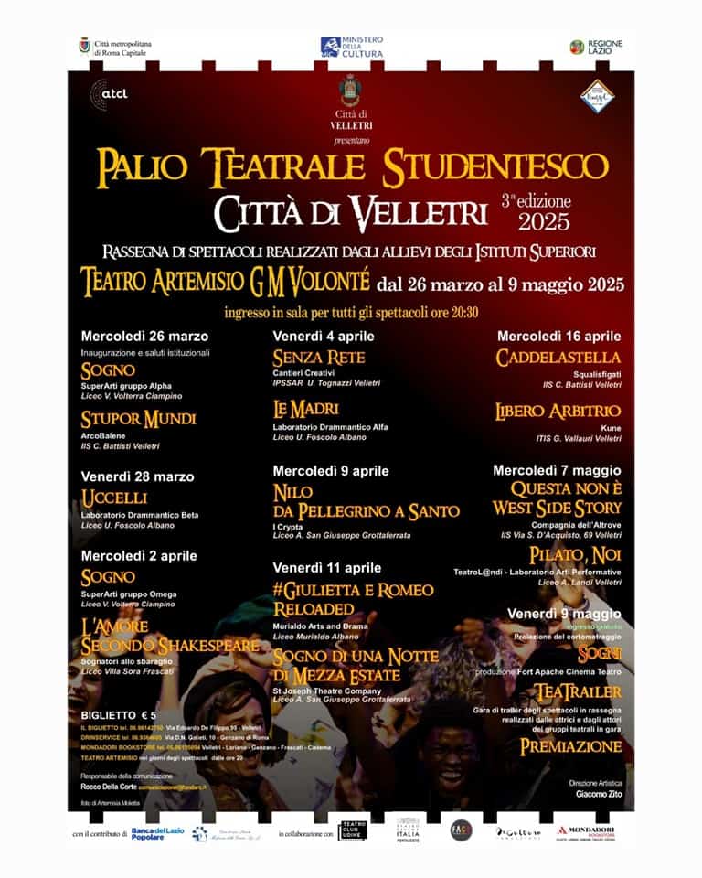 “L’ Associazione Teatrale fra i Comuni del Lazio è orgogliosa di sostenere, anche per l’edizione 2025, un progetto di grande valore come il Palio Teatrale Studentesco “Città di Velletri”. Dopo lo straordinario successo del 2024, confermiamo l’impegno nel garantire agli studenti un’opportunità unica per esprimersi artisticamente, mettersi in gioco attraverso le discipline sceniche. Un’esperienza che arricchisce, ispira e forma le nuove generazioni, consolidando il legame tra teatro, educazione e territorio”, ha detto invece la direttrice artistica dell’A.T.C.L. Isabella Di Cola.