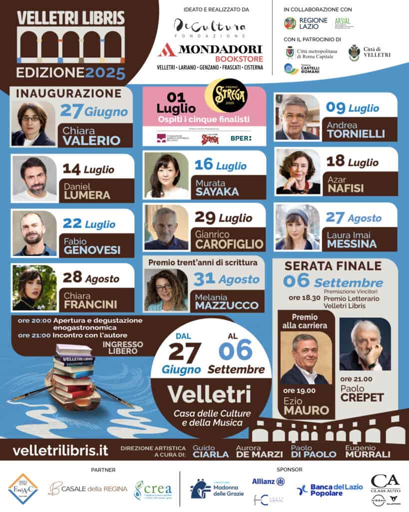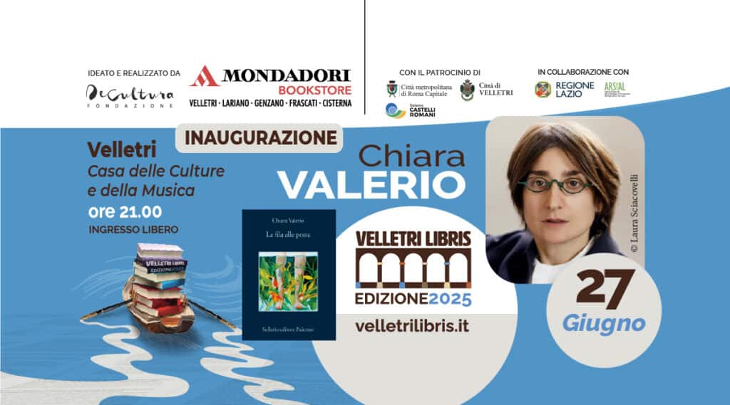 Tutto pronto per l’inaugurazione di “Velletri Libris” 2025, la rassegna letteraria dell’estate veliterna, ideata e realizzata dalla Fondazione De Cultura e dalla Mondadori Bookstore Velletri – Lariano – Genzano – Frascati – Cisterna. L’iniziativa è resa possibile grazie al contributo della Regione Lazio e di Arsial, e si avvale del patrocinio della Città di Velletri, della Città Metropolitana di Roma Capitale e del Sistema Castelli Romani. La direzione artistica è a cura di Guido Ciarla, Aurora De Marzi, Paolo Di Paolo ed Eugenio Murrali. Primo appuntamento, attesissimo, venerdì 27 giugno dalle ore 20 al Chiostro della Casa delle Culture e della Musica di Velletri. Il ricco programma prevede per la prima data l’incontro con l’autrice Chiara Valerio, finalista al Premio Strega 2024.