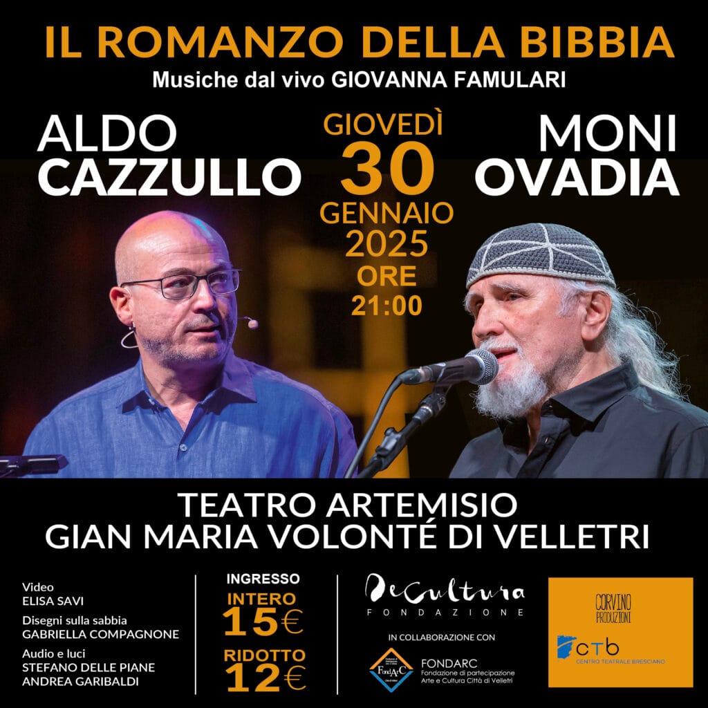 Giovedì 30 gennaio 2025 alle ore 21 un grande evento, fuori abbonamento, al Teatro Artemisio-Volonté di Velletri. Due grandissimi personaggi del panorama intellettuale italiano e internazionale saliranno sul palcoscenico veliterno con uno spettacolo indimenticabile, per un’iniziativa promossa dalla Fondazione De Cultura in collaborazione con la Fondazione di Partecipazione Arte e Cultura Città di Velletri: “Il romanzo della bibbia”.