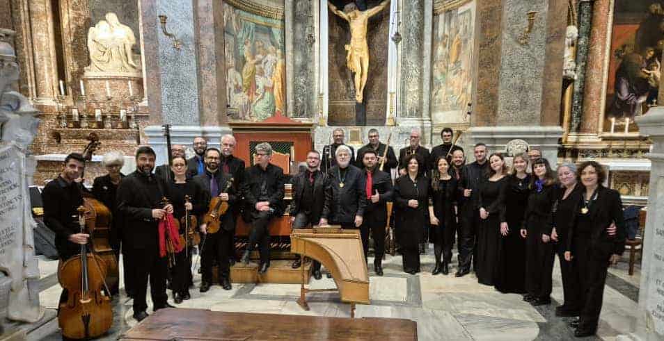 Sotto la sensibile direzione di Flavio Colusso, la Cappella Musicale di Santa Maria dell’Anima e la Cappella Musicale di San Giacomo – storiche istituzioni dirette ai suoi giorni dallo stesso Giovannelli – insieme all’Ensemble Seicentonovecento, cui si uniscono alcuni cantori del Coro Ruggero Giovannelli di Velletri, interpretano le musiche a quattro, otto e dodici voci di quel grande affresco musicale costituito dalla Missa cantantibus organis Caecilia, «lavoro nobile e grandioso, degno del sommo Pierluigi e dei suoi magnifici seguaci», scritto a più mani dal Palestrina, Giovannelli e da altri importanti Maestri, esponenti della Scuola musicale romana.