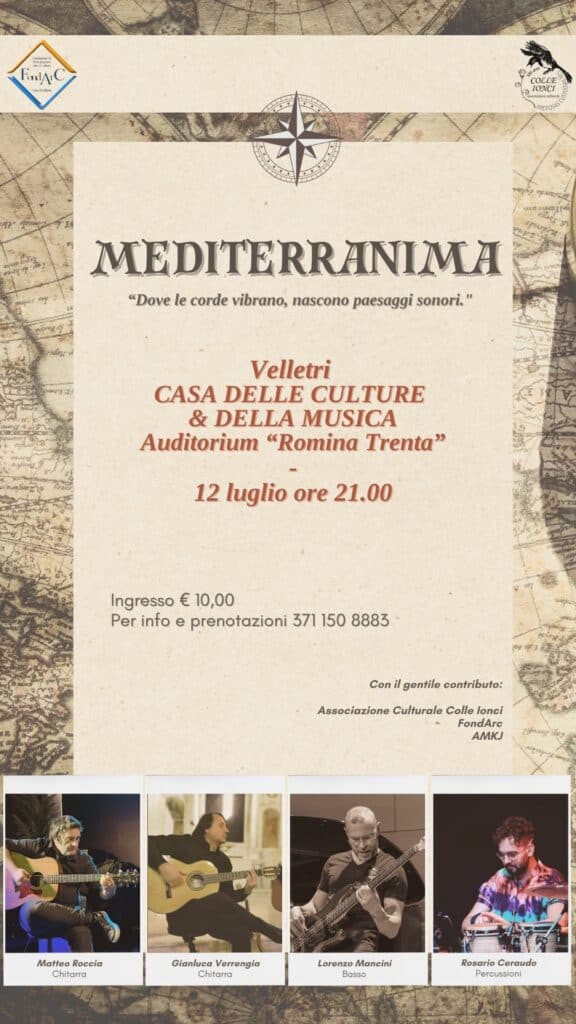 Sabato 12 luglio 2025 alle ore 21:00, il Chiostro della Casa delle Culture e della Musica di Velletri ospiterà Mediterranima, un concerto dove le corde vibrano dando vita a suggestivi paesaggi sonori.