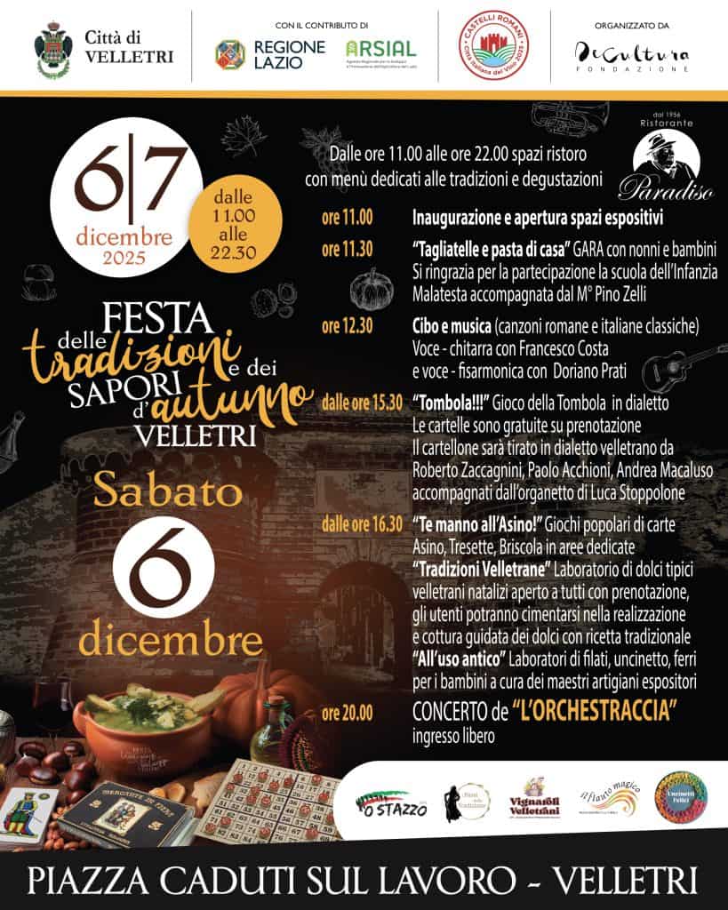 Arriva a Velletri la “Festa delle Tradizioni e dei Sapori d’Autunno”, in programma sabato 6 e domenica 7 dicembre 2025, dalle ore 11 alle 22, in Piazza Caduti sul Lavoro. Un evento imperdibile all’insegna della cultura popolare, del buon cibo e dell’identità locale, promosso dal Comune di Velletri, con il contributo di Regione Lazio e ARSIAL, nell’ambito del progetto “Castelli Romani. Città del Vino”. A organizzare l’iniziativa è la Fondazione De Cultura, in collaborazione con realtà del territorio come O’ Stazzo, i Passi della Tradizione, Vignaroli Velletrani, Ristorante Paradiso e Il Flauto Magico.