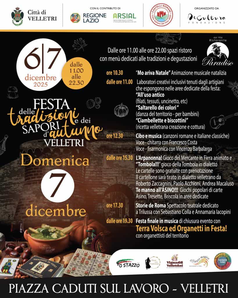 Domenica 7 dicembre, la festa continuerà sin dalla mattina. Alle 10.30 “Mo ariva Natale”, animazione musicale natalizia. Dalle 11 gli artigiani daranno vita a una serie di laboratori creativi inclusivi dedicati a grandi e bambini: ancora filati e uncinetto nel solco dell’uso antico, ma anche danze popolari con il “Saltarello dei colori”, dolci velletrani da realizzare e cuocere. Alle 12.30 di nuovo la musica dal vivo con Francesco Costa e Vincenzo Barbarlarga, mentre alle 15.30 il gioco del mercante in fiera animato e la tombola in dialetto saranno protagonisti, sempre con Roberto Zaccagnini, Paolo Acchioni e Andrea Macaluso. Alle 17.30, il palco si illuminerà con “Storie de Roma”, omaggio poetico a Trilussa portato in scena da Sebastiano Colla e Annamaria Iacopini. La chiusura dell’evento, prevista dalle 20, sarà affidata a una cena con musica dal vivo e all’energia travolgente del gruppo Terra Volsca ed Organetti in Festa, con i giovani organettisti del territorio, che saluterà il pubblico con una grande festa finale.