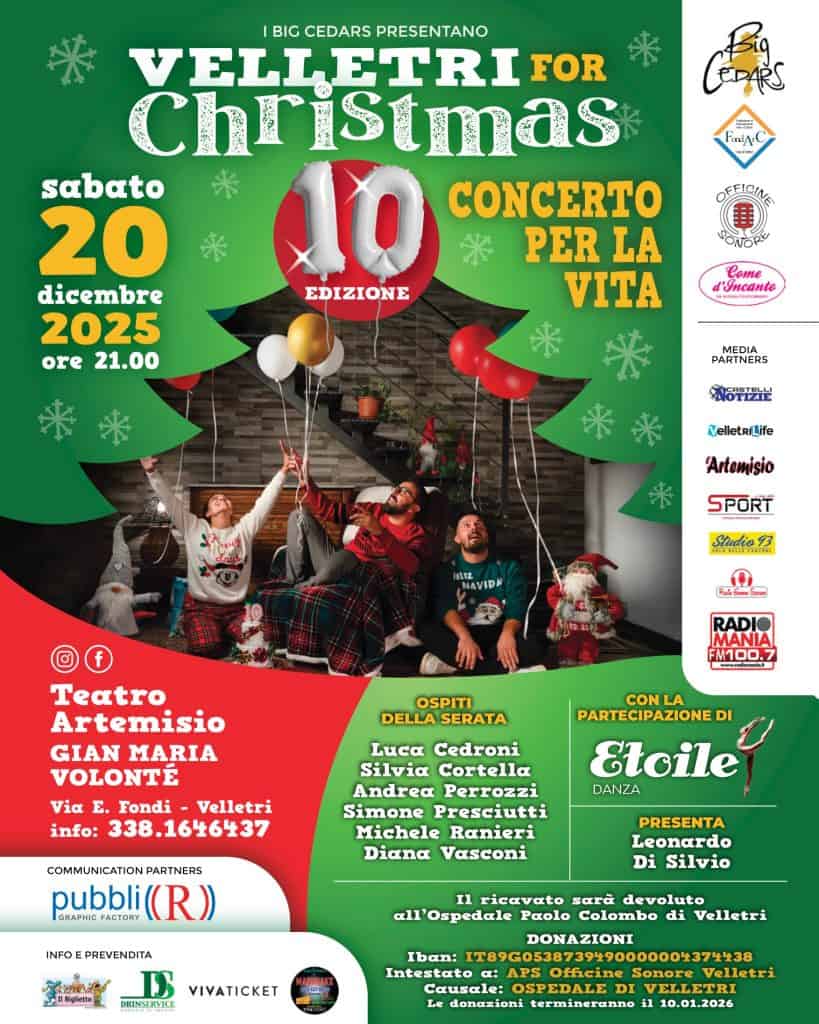 Torna anche quest’anno, per la sua decima edizione, l’attesissimo evento natalizio “Velletri for Christmas – Concerto per la Vita”, in programma sabato 20 dicembre alle ore 21 presso il Teatro Artemisio Gian Maria Volonté, con l’organizzazione del Big Cedars (Graziano, Irene e Lorenzo Cedroni, noti musicisti veliterni ben noti anche nel panorama nazionale). Velletri Life sarà media partner dell’evento.