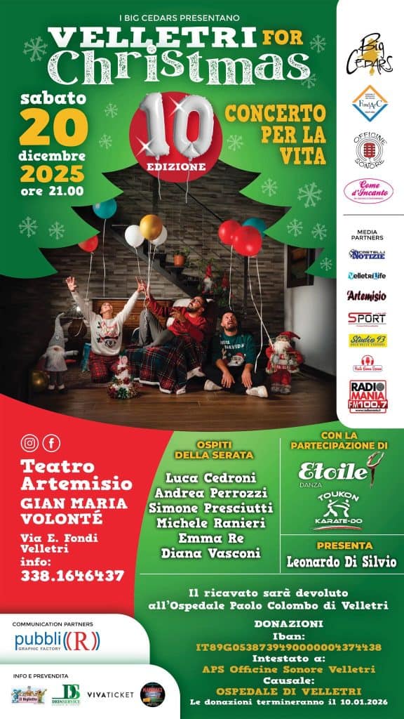 Pertanto, vi invito con tutto il cuore a unirvi a noi sabato 20 dicembre alle ore 21.00 presso il teatro Artemisio Gian Maria Volonté di Velletri. Sarà un’occasione unica per celebrare la musica, la solidarietà e il nostro amore per la comunità.