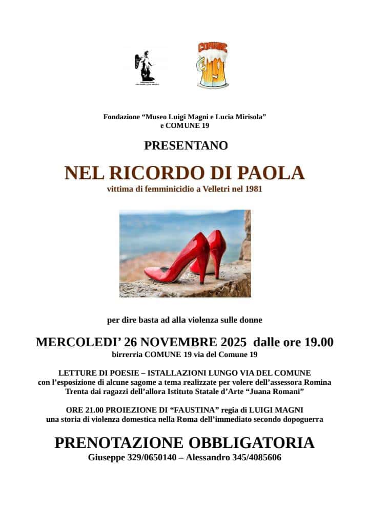 Come ormai da qualche anno, nel pomeriggio del 25 Novembre alle ore 17.30 ci ritroveremo in Via XXIV Maggio per un momento di ricordo e di riflessione sul luogo dove il 20 Aprile del 1981 giorno di Pasquetta venne freddata per gelosia dal suo fidanzato la giovane infermiera veliterna Paola Silvestrini. Lui si è suicidato poco distante. Riparlare dopo tanti anni di questo dramma di casa nostra, ha generato numerosi spunti di riflessioni tanto da dar vita ad una serata particolare il 26 Novembre a partire dalle 19.00 presso la birreria Comunediciannove (Via del Comune 19) dove tra letture di poesie piccoli intermezzi teatrali sarà possibile riflettere su questo drammatico aspetto della nostra attualità. Alle 21.00 sarà proiettato il film “Faustina” del maestro Luigi Magni, una storia di violenza domestica nella Roma del secondo dopoguerra.