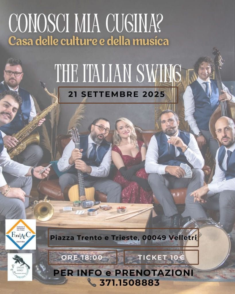 Domenica 21 settembre 2025 ore 18 “Conosci Mia Cugina? THE ITALIAN SWING”, all’auditorium “Romina Trenta” della Casa delle Culture e della Musica. “Conosci Mia Cugina?” è uno swing show a trecentosessanta gradi, una macchina del tempo per rivivere il sound degli anni ’30, ’40 e ’50 del novecento Italiano.