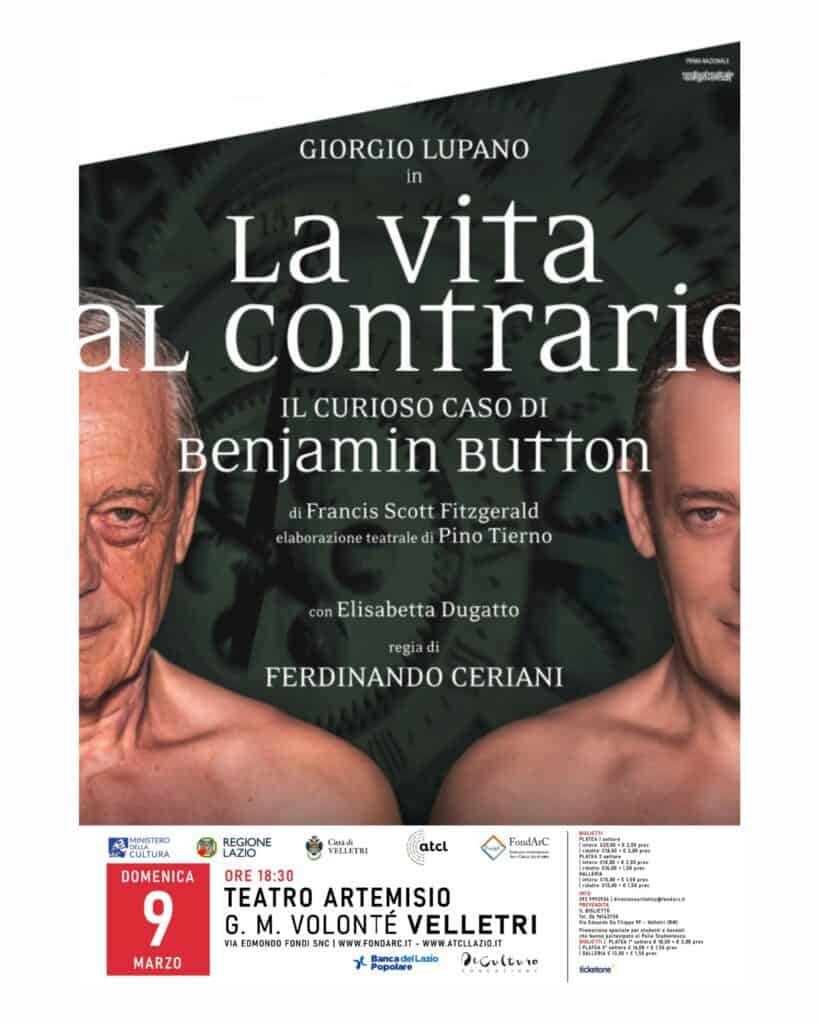 Domenica 9 marzo, alle 18.30, nuovo appuntamento con la straordinaria programmazione della stagione di prosa al Teatro Artemisio-Gian Maria Volonté di Velletri. Il Comune di Velletri e ATCL, circuito multidisciplinare del Lazio sostenuto da MIC – Ministero della Cultura e Regione Lazio, insieme alla Fondazione di Partecipazione Arte e Cultura Città di Velletri diretta da Giacomo Zito, presentano il settimo spettacolo in abbonamento con protagonista Giorgio Lupano. “La vita al contrario. Lo strano caso di Benjamin Button” di Francis Scott Fitzgerald, per l’elaborazione teatrale di Pino Tierno e la regia di Ferdinando Ceriani. Insieme a Lupano sarà in scena Elisabetta Dugatto.