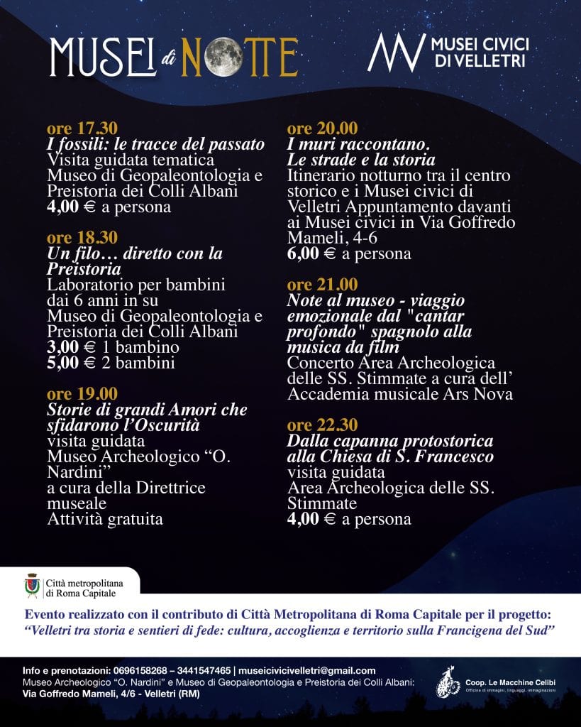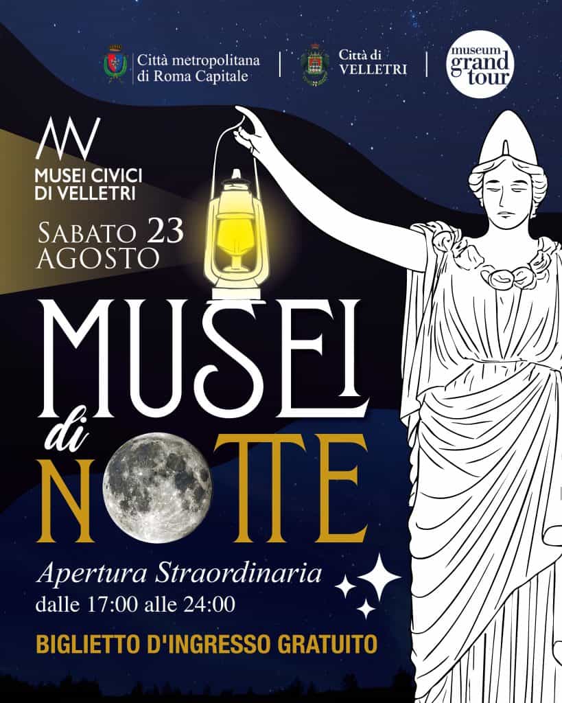 Sabato 23 agosto 2025 i Musei di Velletri ospitano la terza edizione di Musei di notte, con eventi e iniziative dalle 17.00 alle 24.00. Un ricco programma volto a valorizzare in una notte estiva il patrimonio culturale della città. Il Museo Archeologico “Oreste Nardini” e il Museo di Geopaleontologia e Preistoria dei Colli Albani, ubicati in Via Goffredo Mameli, dietro il Palazzo Comunale, e l’Area Archeologica delle SS.Stimmate, in Via delle Stimmate, contengono reperti e testimonianze della storia di Velletri e del circondario fondamentali per la ricostruzione storica delle ere passate.