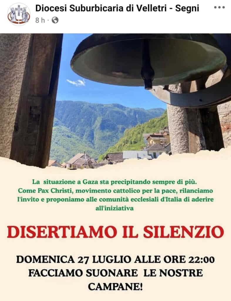 Alle ore 22 in punto, poi, tutte le campane della diocesi di Velletri hanno suonato insieme, lanciando un segnale forte e simbolico di solidarietà e speranza. Un suono che ha attraversato la città come un invito alla pace e alla consapevolezza. L’iniziativa, promossa da Pax Christi e rilanciata dalla Diocesi Suburbicaria di Velletri-Segni, è stata intitolata “Disertiamo il silenzio”. Il messaggio è chiaro: «La situazione a Gaza sta precipitando sempre di più. Come Pax Christi, movimento cattolico per la pace, rilanciamo l’invito e proponiamo alle comunità ecclesiali d’Italia di aderire all’iniziativa».