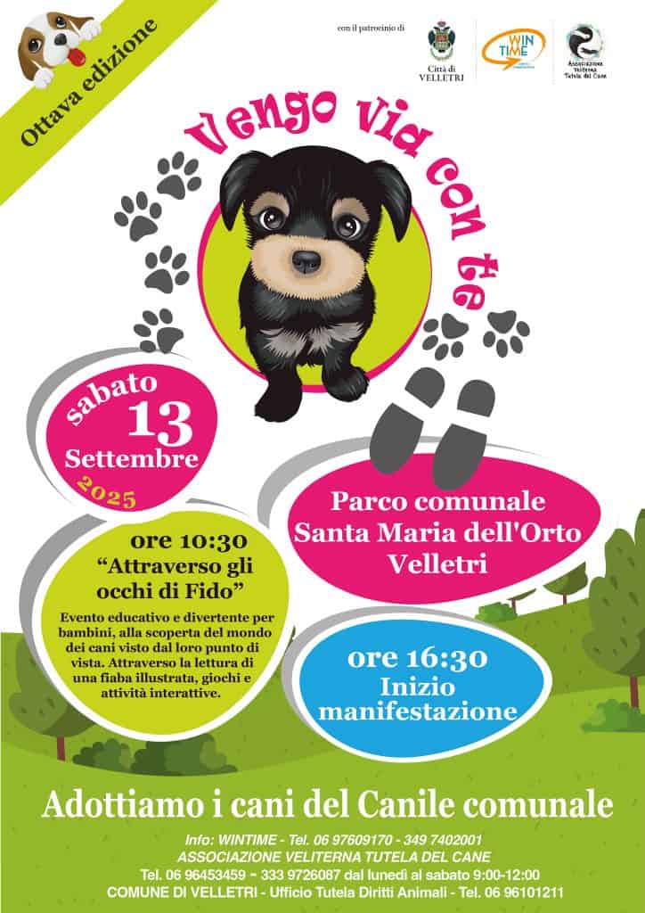 Torna anche quest’anno l’atteso appuntamento con “Vengo via con te”, adottiamo i cani del canile comunale, giunto alla sua ottava edizione. L’iniziativa, organizzata dall’Ageniza Wintime Events & Communication di Ottavia Lavino, in collaborazione con l’Associazione Veliterna Tutela del Cane e patrocinata dal Comune di Velletri, nasce con l’obiettivo di sensibilizzare la cittadinanza sull’importanza dell’adozione consapevole e sul valore di dare una nuova vita agli amici a quattro zampe che vivono nel nostro canile comunale.
